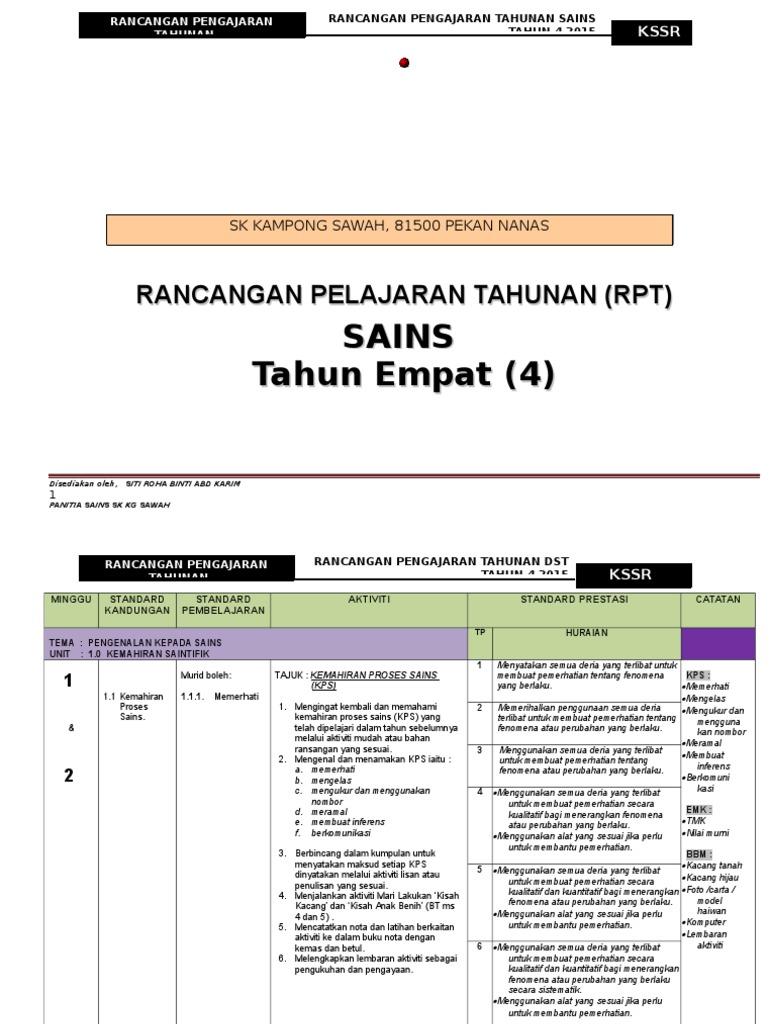 Berikut merupakan sedikit ulasan, perbandingan serta kesimpulan berkaitan dengan silibus sains tahun 4 (2020). Rancangan pengajaran tahunan (rpt) ini disediakan oleh rozayus academy. Untuk itu disini kami akan berbagi contoh rpp 1 lembar daring kelas 4 tahun 2020/2021. Rpt kssr sains sk tahun 4 saniah khalid,sk kandis. Sekolah kebangsaan (m) bombalai peti surat 62162, 91031 tawau.