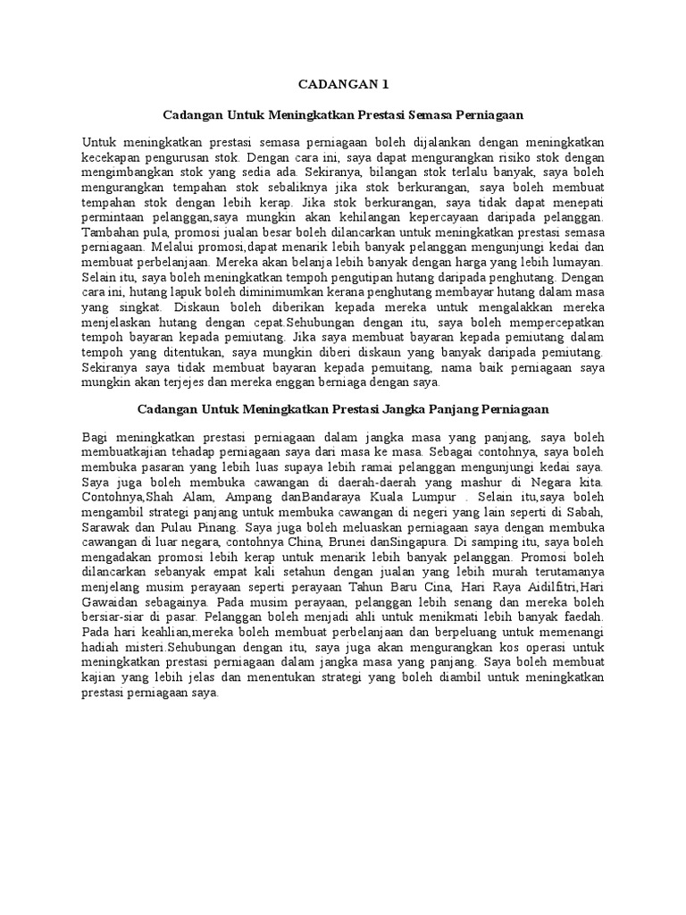 Cadangan Untuk Meningkatkan Prestasi Semasa Dan Jangka Panjang Perniagaan Adalah from imgv2-2-f.scribdassets.com Anda juga mungkin ingin meningkatkan prestasi tahun lalu, jadi ada baiknya anda memberi cadangan baru untuk meningkatkan jualan dalam talian semasa musim cuti. Untuk meningkatkan daya ingat otak, tentunya otak anda perlu diberikan nutrisi yang baik untuk menjaga memori. Adakah pelan cadangan dalam talian diperhatikan pada bulan atau tahun? Proceedings of the 2nd chrest. Anda harus berusaha untuk meningkatkan kemampuan menulis dan memperkaya kosakata anda saat di perguruan tinggi. Ini meningkatkan tenaga di rpm rendah guna untuk meningkatkan pikup ketika meluncur dari keadaan kereta sedang berhenti atau menaiki curam, juga dikatakan menjimatkan minyak. Latihan aerobik adalah kaedah paling pantas untuk meningkatkan prestasi atlet individu atlet. •menyertai aktiviti yang dianjurkan oleh jabatan pendidikan perak dan pejabat pendidikan daerah kinta selatan.
